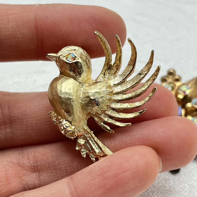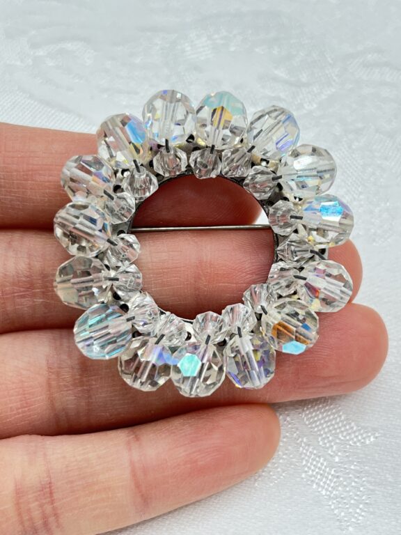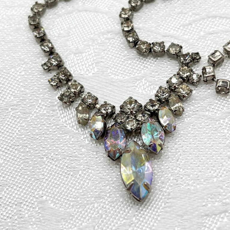 When you’re looking at sparkly vintage jewelry pieces such as brooches and bracelets, you’ll quickly find out that not all rhinestones are the same. One of the rhinestone types that really stood out to me when I made my foray into vintage jewelry was the AB or aurora borealis rhinestone. It’s not just a regular rhinestone—it’s a cool rhinestone, pulling in your attention with its gorgeous iridescence.